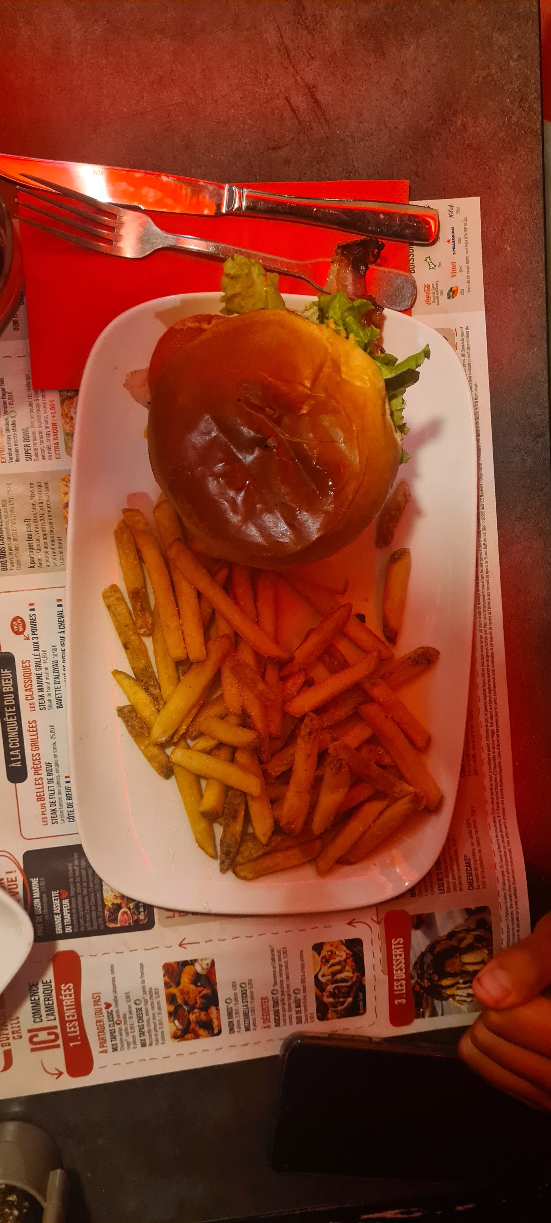 Posté le 20/12/2023 à 21:19"Ce lieu à la décoration chic et moderne a su me ravir tout autant que mes papilles. Le pepper burger présente un mélange des saveurs fort appréciable, l'équilibre de la sauce poivre est idéal et la cuisson du steak saignante à souhait. Le tout pour un prix abordable, ce qui n'est pas négligeable en ces temps d'inflation. Attention cependant à ne pas vous méprendre, malgré ce qu'il est écrit, les cookies délices ne sont pas accompagnés de chNatilly, mais bien de chantilly. Bien à vous"