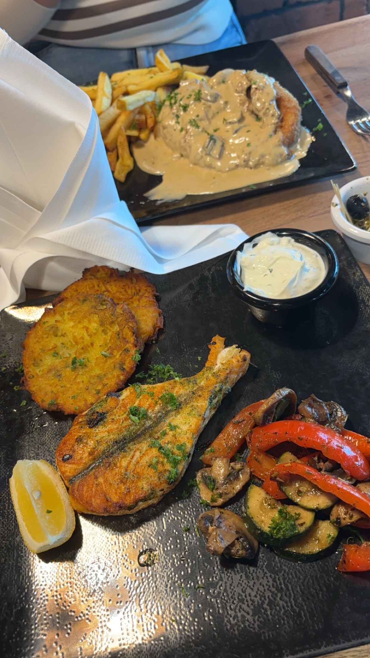 Posté le 06/04/2024 à 06:33"Passage pour le déjeuner, juste avant d'aller au salon du 2 roue. Petit cordon bleu au munster accompagné de ces galettes de râpé de pomme de terre et une sauce champignon, très bon ! Il faut toutefois prévenir que le cordon bleu est tenu par des piques en bois (je m'en suis aperçu quand il été dans ma bouche...) Je reviendrai 👍"
