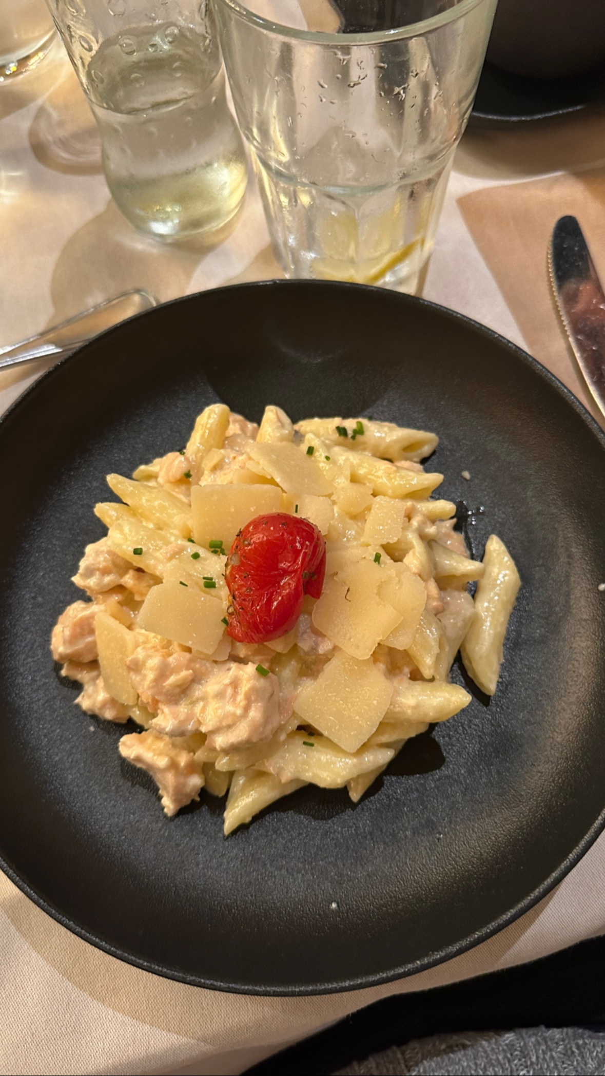 C'est la première fois que je mange de pâtes au saumon qui n'a pas de goût ! 28€ pour ça... Et puis la dame de l'accueil qui nous regarde comme si on avait rien à faire ici et qui nous sème (sachant que je marche avec une canne et ça se voyait...). Et malgré l'espace on était les uns sur les autres.